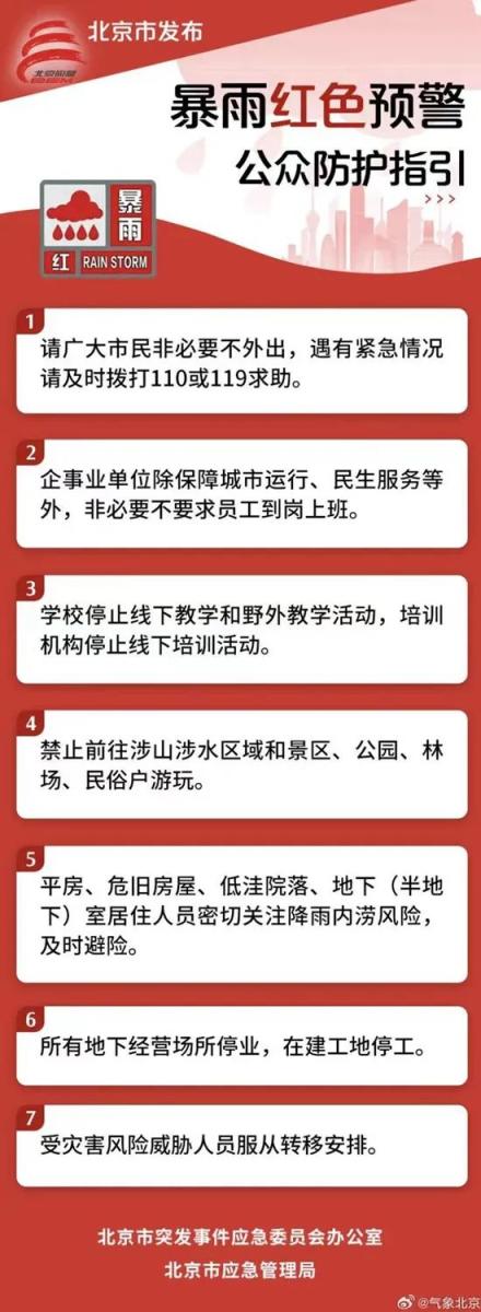 除暴雨红色预警外,目前北京市地质灾害气象风险橙色预警、山洪灾害黄色预警、积水内涝黄色预警、洪水蓝色预警均在生效中。与此同时,北京市防汛指挥部启动全市防汛一级应急响应,建议市民非必要不外出。