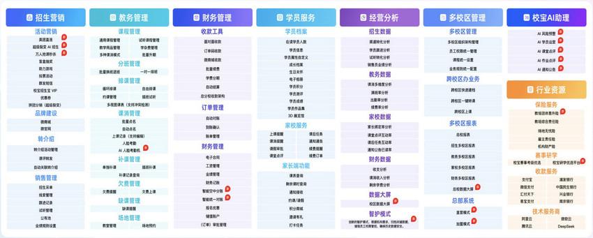 出色的市场表现,源于企业对产品研发的持续投入与战略远见。自2020年App重构以来,校宝坚持每年一次大版本迭代,累计研发投入超过5000万元,确保产品能力始终处于技术与行业前沿。目前,校宝App基于教培管理系统,已集成招生营销、教务管理、财务管理、学员服务、经营分析、多校区管理及AI助手等多项核心能力,并通过链接优质供应商资源,为机构提供保险、赛事、研学、收款等全方位生态赋能,真正实现“一个App解决所有经营问题”。