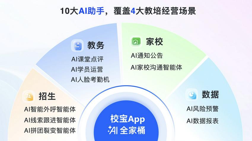 邹依依在分享中指出,校宝基于海量教培数据、开放大模型对接能力及深厚的互联网研发积淀,推出“AI全家桶”智能化运营综合解决方案。该方案在招生、教务、家校、数据四大核心场景中落地十大AI助手,已在实际应用中验证效果,能够系统性解决机构80%的经营难题。所有AI助手基于统一数据底层协同作业,形成“运营产生数据—数据驱动决策—决策优化运营”的智能闭环。这一架构突破了单点AI工具的局限,为教培行业提供了首个真正意义上的全局智能化解决方案。