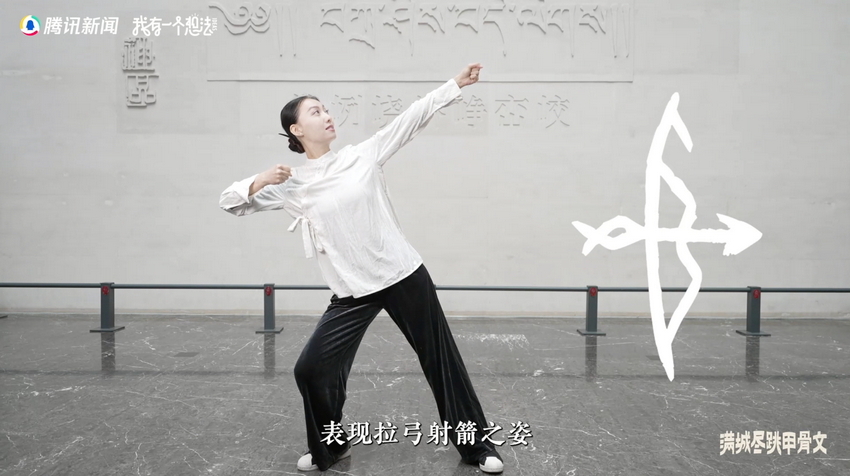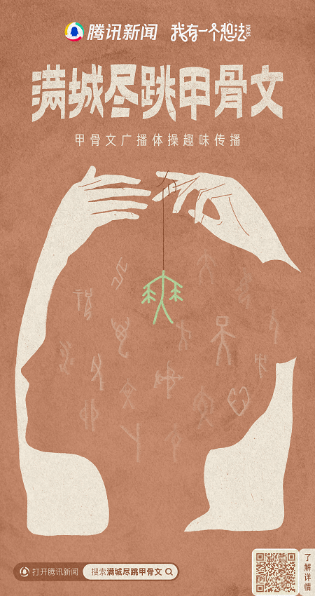 如果说《满城尽知甲骨文》是“看懂”甲骨文,那么《满城尽跳甲骨文》则是“体验”甲骨文。创想者龚慕凡指出,甲骨文本身充满动态美感——许多字形源自人体姿态或自然动作,若将其转化为肢体语言,或许能让人更直观地感受汉字的生命力。基于这一创想,腾讯新闻联合龚慕凡打造了《甲骨文广播体操》精品视频。